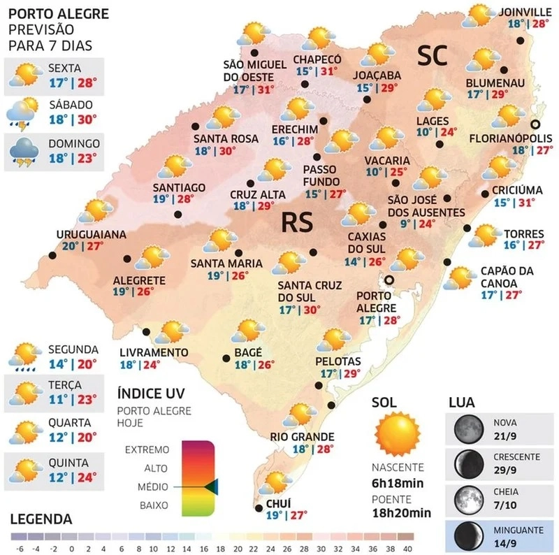 A sexta-feira, 19, será de elevação nas temperaturas no Rio Grande do Sul, seguida por avanço de instabilidade. Conforme a MetSul Meteorologia, o sol aparece com nuvens na maior parte dos municípios, e as temperaturas alcançam os 30°C.
