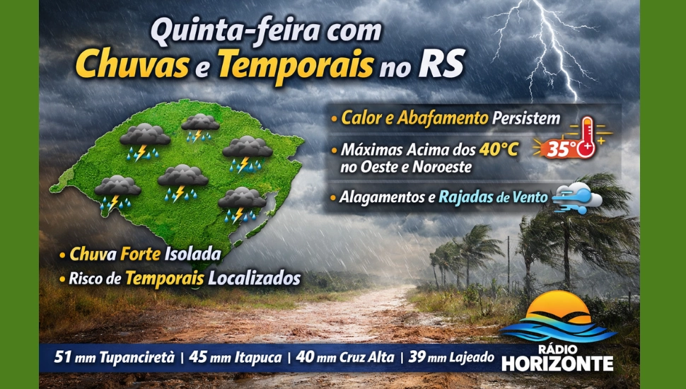 O calor intenso favoreceu a formação de áreas de instabilidade, com chuva forte em pontos isolados e temporais localizados. Até o fim da tarde de quarta-feira, os maiores volumes de chuva foram registrados em Tupanciretã e Ibirubá, com 51 mm, seguidos por Itapuca (45 mm), Três Passos (43 mm), Ilópolis (42 mm), Putinga (41 mm), Cruz Alta e Arvorezinha (40 mm), Lajeado (39 mm), Teutônia e Bento Gonçalves (34 mm) e Horizontina (30 mm).